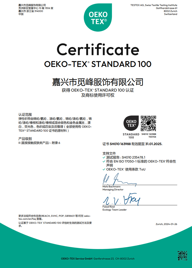 目前,公司產(chǎn)品已通過Oeko-Tex standard 100生態(tài)紡織一級認(rèn)證。